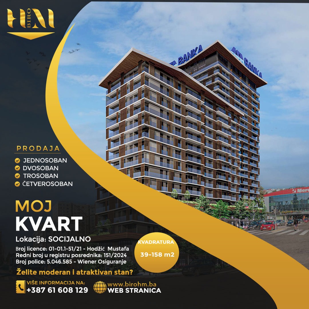 BIRO HM nudi na prodaju stanove u stambeno-poslovnom kompleksu MOJ KVART, smještenom u Sarajevu, naselje Socijalno, u ulici Marka Marulića.Stambeno-poslovni objekat se sastoji od 20 etaža s različitim tipovima stanova: dvosobni, trosobni, četverosobni, te luksuzni stanovi s galerijom koji se nalaze na 20. spratu.Kompleks nudi stanove površine od 57 m² do 158 m², prilagođene različitim potrebama i ukusima.