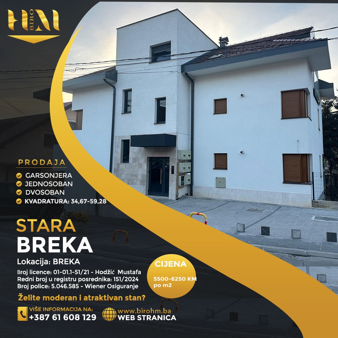 BIRO HM vam ekskluzivno nudi prodaju 6 stanova na Staroj Breki, Općina Centar.🏠 Prizemlje – 5.500 KM/m²:Stan 1: 58,34 m²Stan 2: 39,72 m²🏠 Prvi sprat – 5.750 KM/m²:Stan 1: 59,28 m²Stan 2: 40,09 m²🏠 Drugi sprat – 6.250 KM/m²:Stan 1: 44,98 m²Stan 2: 34,67 m²🔍 Završeni su tehnički prijem i etažiranje.Za više informacija, kontaktirajte nas direktno putem DM-a ili pozovite na broj telefona.